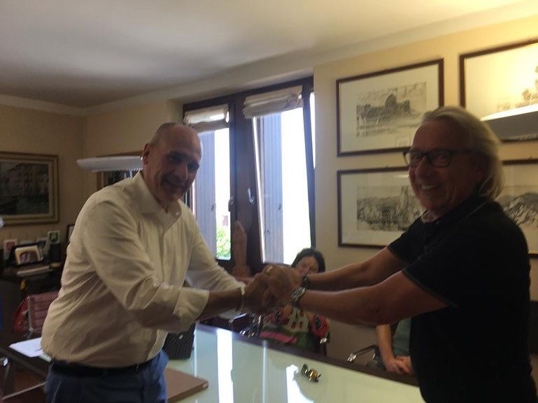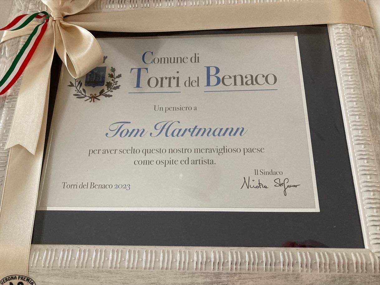 Mein großer Tag in Torri del Benaco: ich habe mich bei der Kommune mit einem Bild bedankt für die tolle Ausstellung letztes Jahr. Der Bürgermeister Stefano Nicotra hat sich genauso gefreut wie ich und mir eine Urkunde der Gemeinde überreicht mit den Worten: alla prossima! Bis zum nächsten mal. Wir haben uns schon über die Planung für 2024 unterhalten, weitere Ausstellungen sind im Gespräch. Ich freu mich sehr. Das alles hätte nie geklappt ohne die tatkräftige Unterstützung von Fausto Giacometti, meinem Freund und Manager für Italien und den Rest der Welt. Vielen Dank auch an Donatella Cavicchioli, die Kulturmanagerin der Gemeinde!