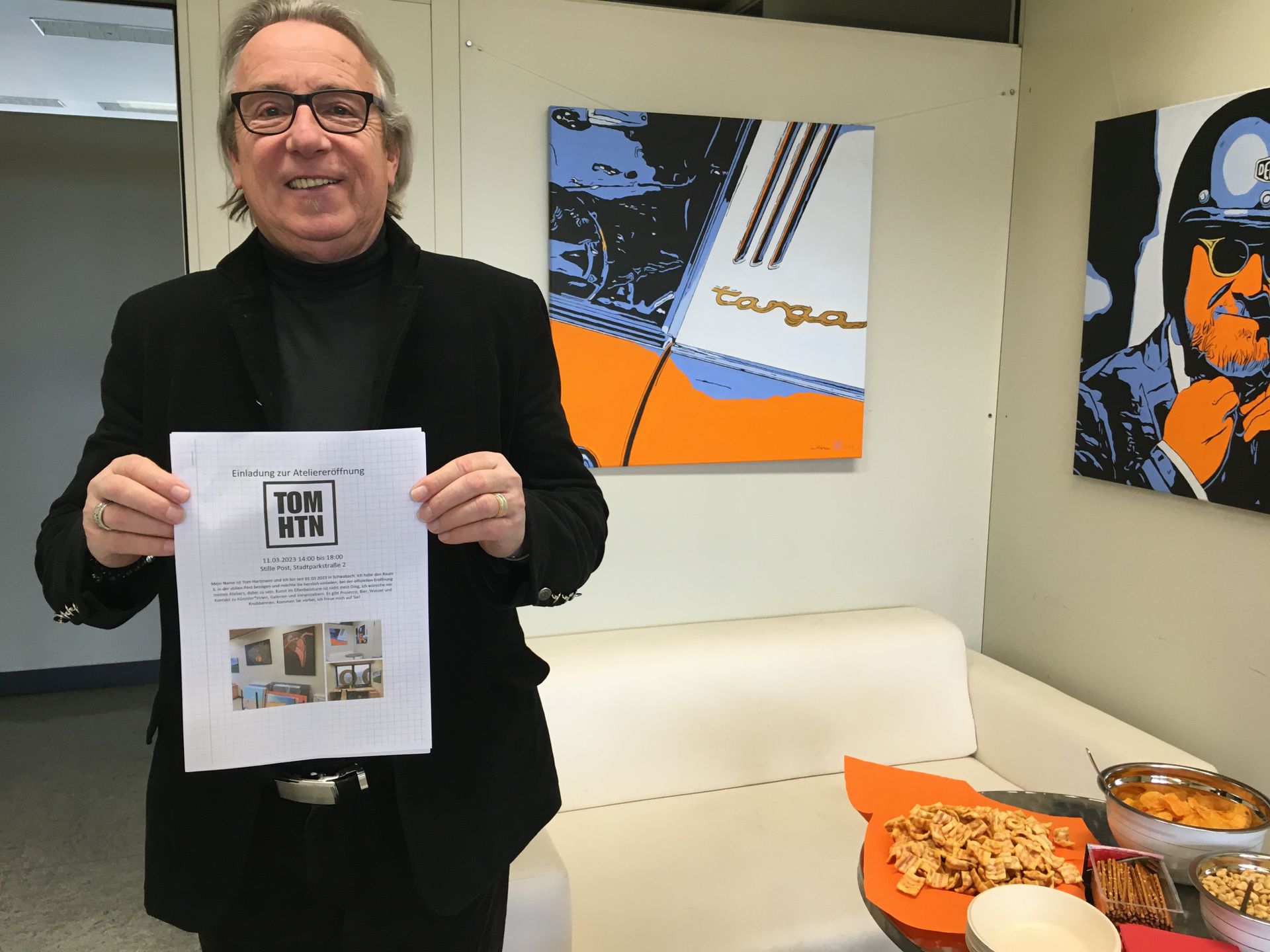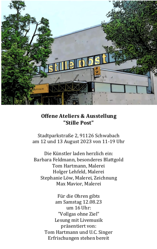 Ein unglaublicher Erfolg für die Ateliergemeinschaft der stillen Post in Schwabach und deren KünstlerInnen Barbara Feldmann, Tom Hartmann, Holger Lehfeld, Steffanie Löw und Max Mavior! So viele interessierte Besucher, angeregte Gespräche und es wurde auch gut verkauft, so ganz nebenbei. Die Lesung war, wie immer, ein super Spaß für alle Anwesenden, natürlich auch für U.C. Singer und mich. Ich habe meine neue Bilderserie "Fancy Cars" ausgestellt und viele, positive Stimmen dazu gesammelt, Kontakte zu Interessenten geknüpft. Diese Serie wird noch erweitert, nächstes Jahr ist eine Ausstellung im Rahmen der Mille Miglia in Brescia am Lago di Garda geplant und eine Teilnahme an der Sportwagencharity im Ofenwerk, Nürnberg. Derzeit habe ich leider noch keine Bilder vom Gedränge in den Räumen. Wir hatten niemanden der das erledigen konnte, es war einfach zu voll. ich werde das hier ergänzen und erweitern sobald mir mehr Material zur Verfügung steht.