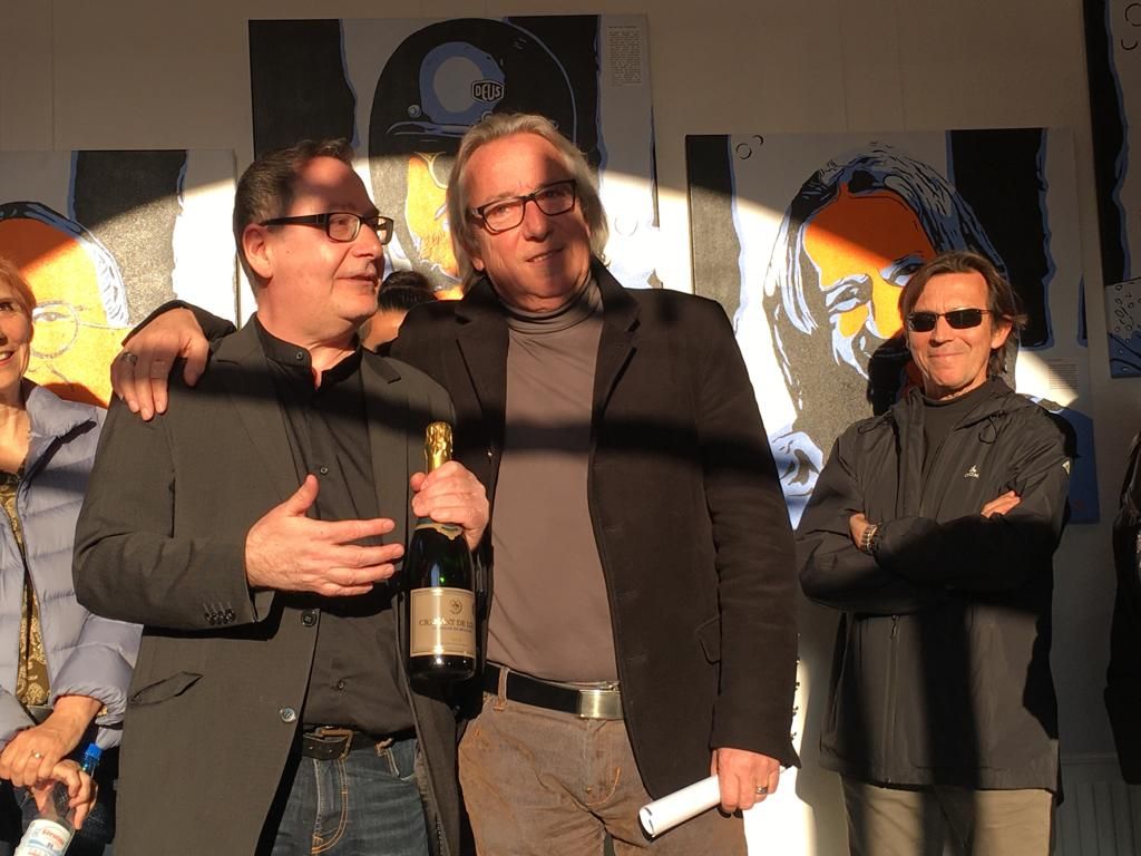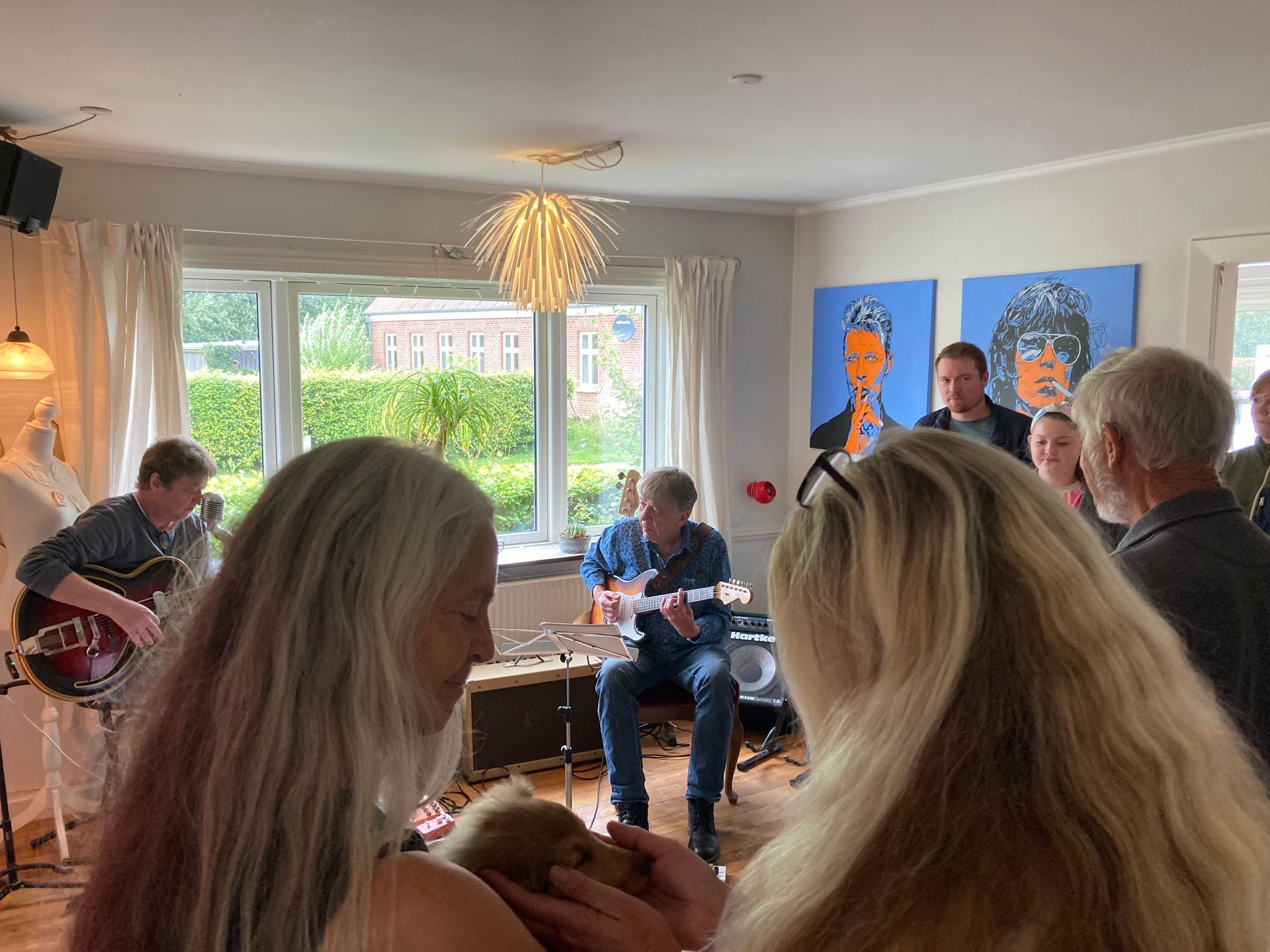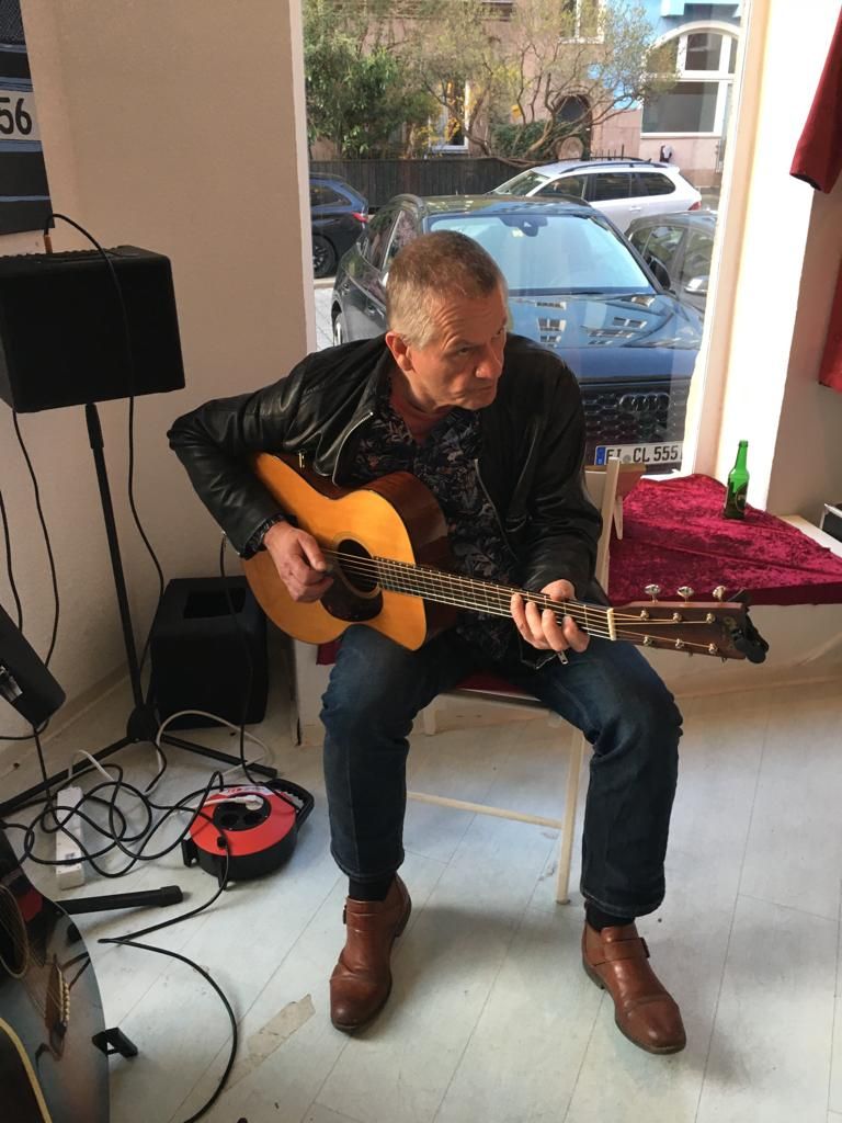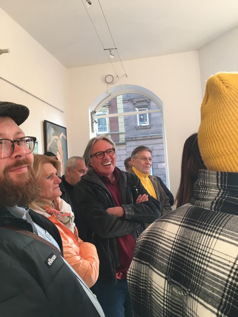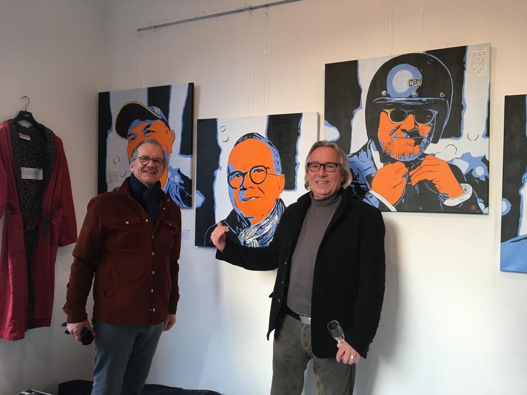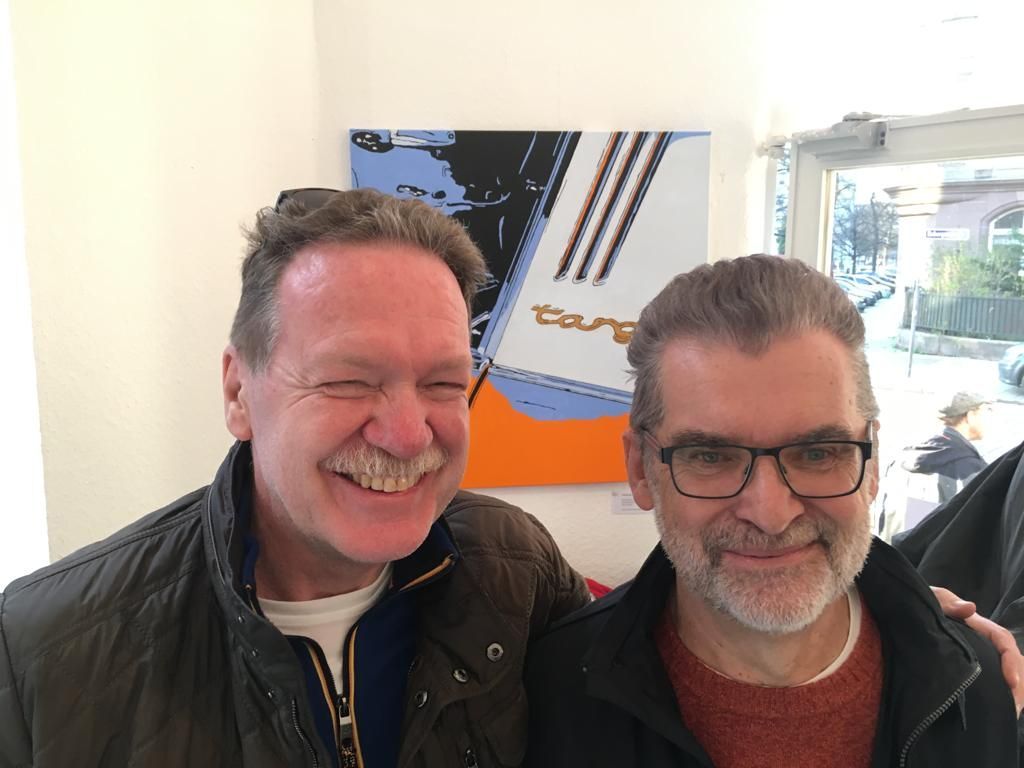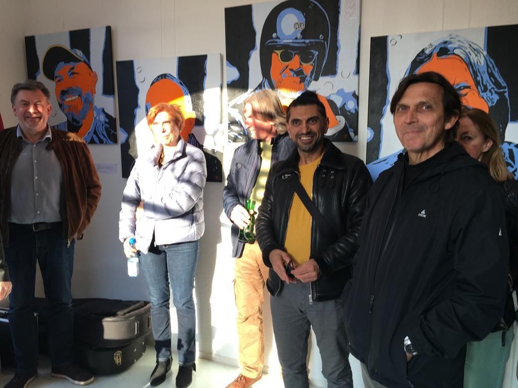 Eine tolle Vernissage am 24.08. um 14:30, eröffnet von dem Duo Frithof & Heiberg, zwei Folk- und Bluesmusikern. Die zwei haben mit Songs von Bob Dylan und vielen anderen Klassikern gleich gute Stimmung in die gut besuchte Galerie gebracht. Das passte perfekt zur "english corner", die ich in diesem Raum eingerichtet hatte. Pop Stars David Bowie, Mick Jagger und Keith Richards und der erst eine Woche vorher fertiggestellte Jaguar XK 120 haben für einen passenden Rahmen gesorgt.