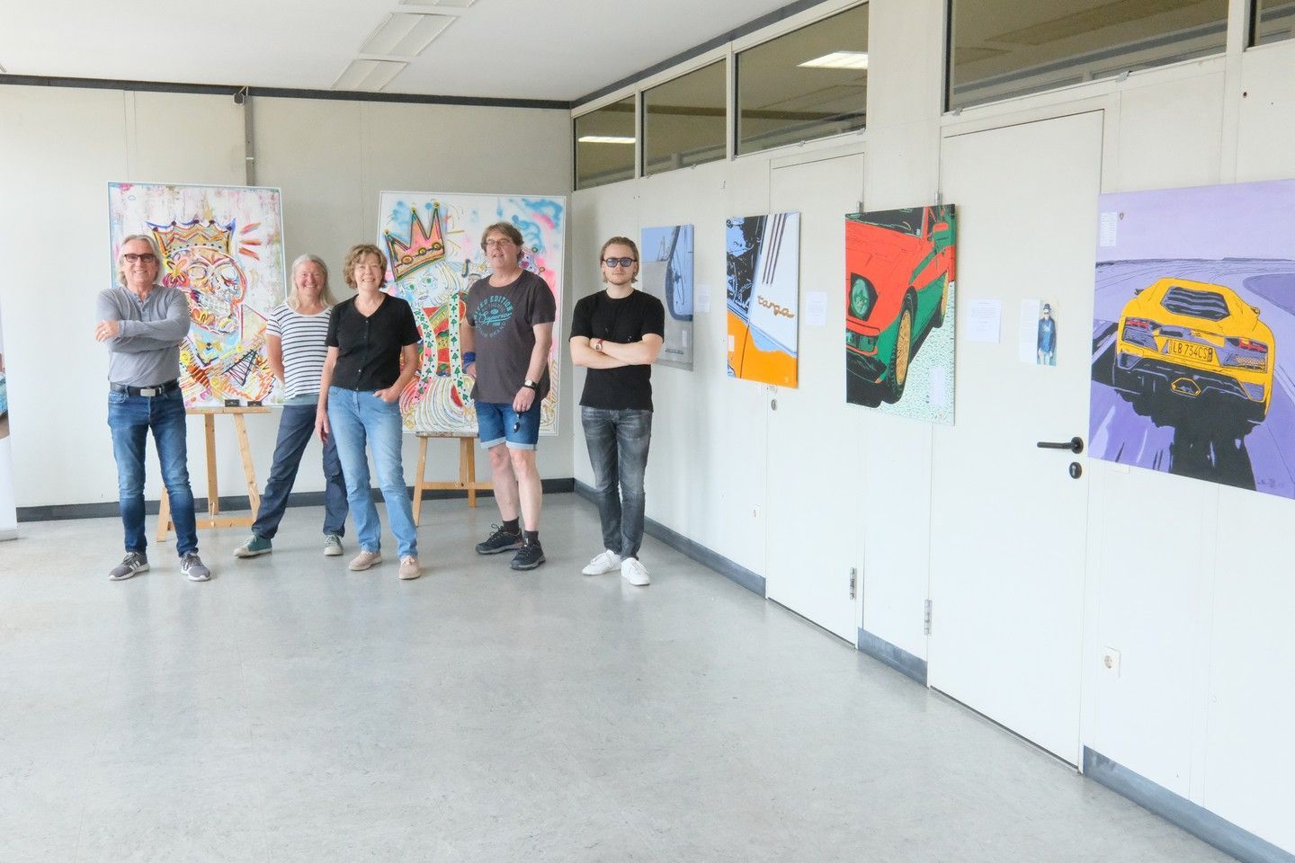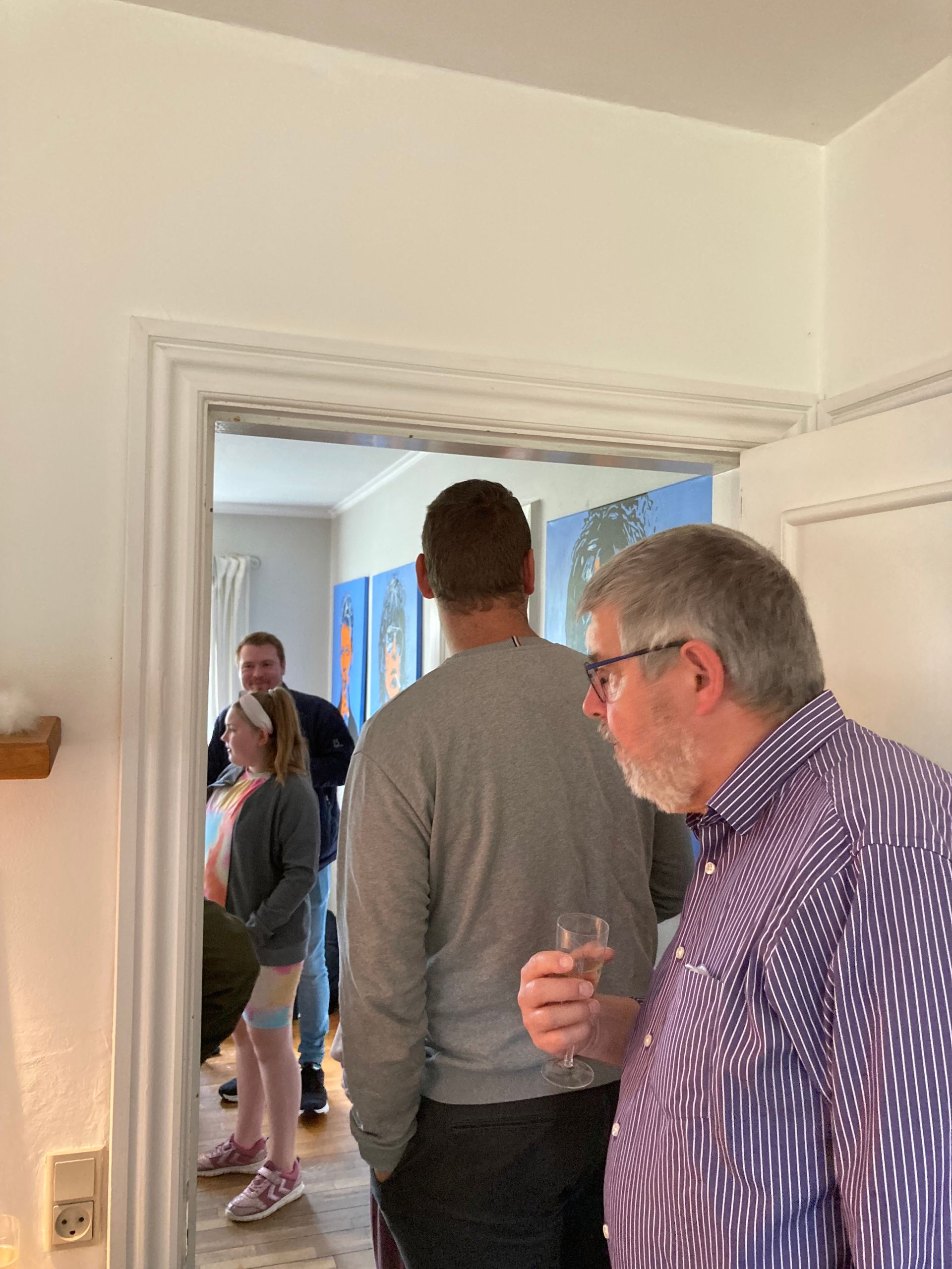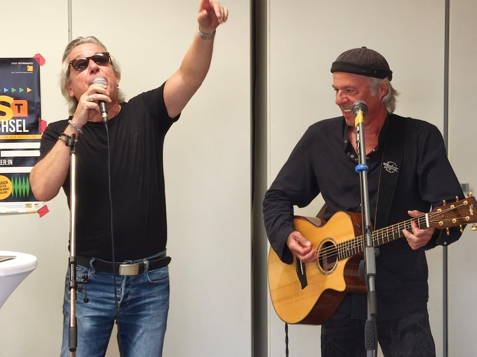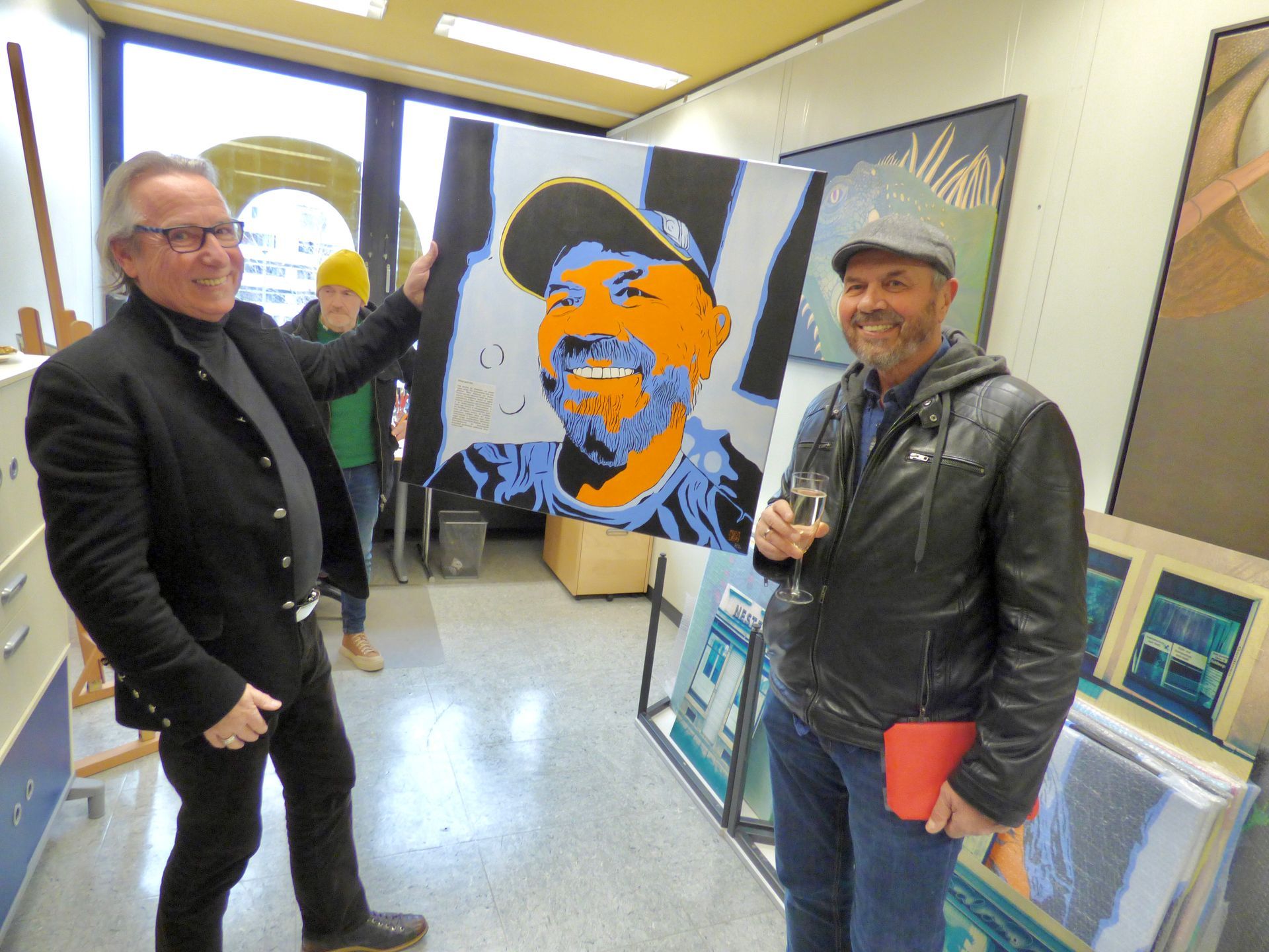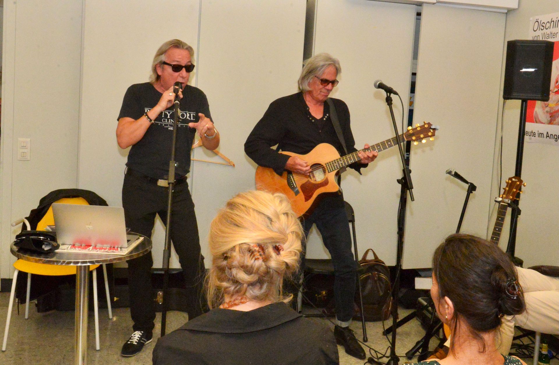 Eine tolle Vernissage am 24.08. um 14:30, eröffnet von dem Duo Frithof & Heiberg, zwei Folk- und Bluesmusikern. Die zwei haben mit Songs von Bob Dylan und vielen anderen Klassikern gleich gute Stimmung in die gut besuchte Galerie gebracht. Das passte perfekt zur "english corner", die ich in diesem Raum eingerichtet hatte. Pop Stars David Bowie, Mick Jagger und Keith Richards und der erst eine Woche vorher fertiggestellte Jaguar XK 120 haben für einen passenden Rahmen gesorgt.