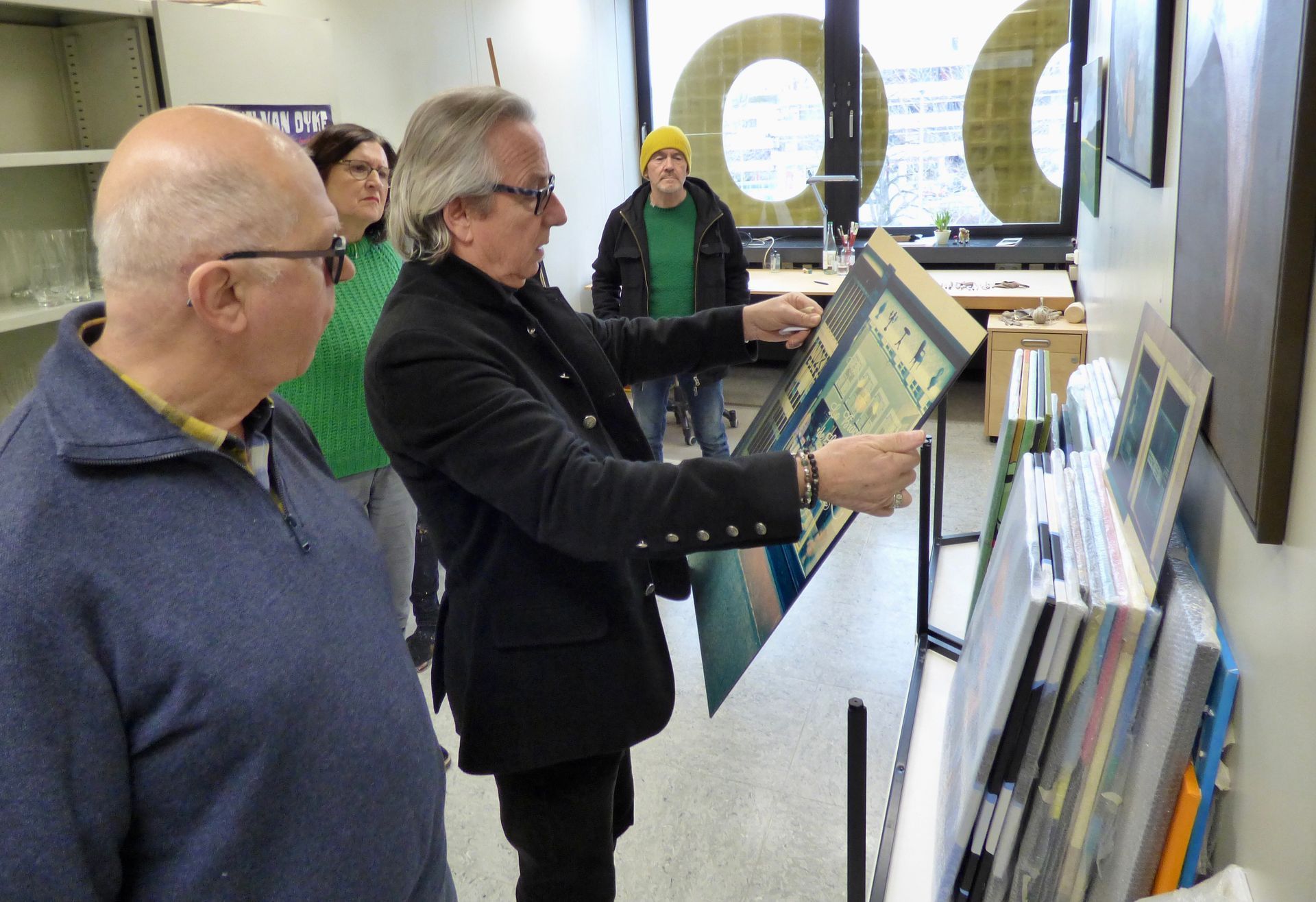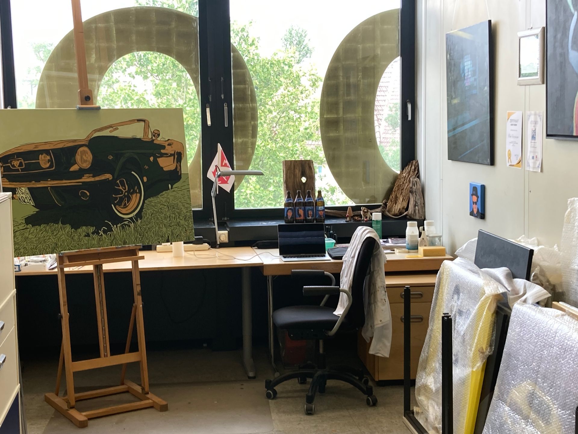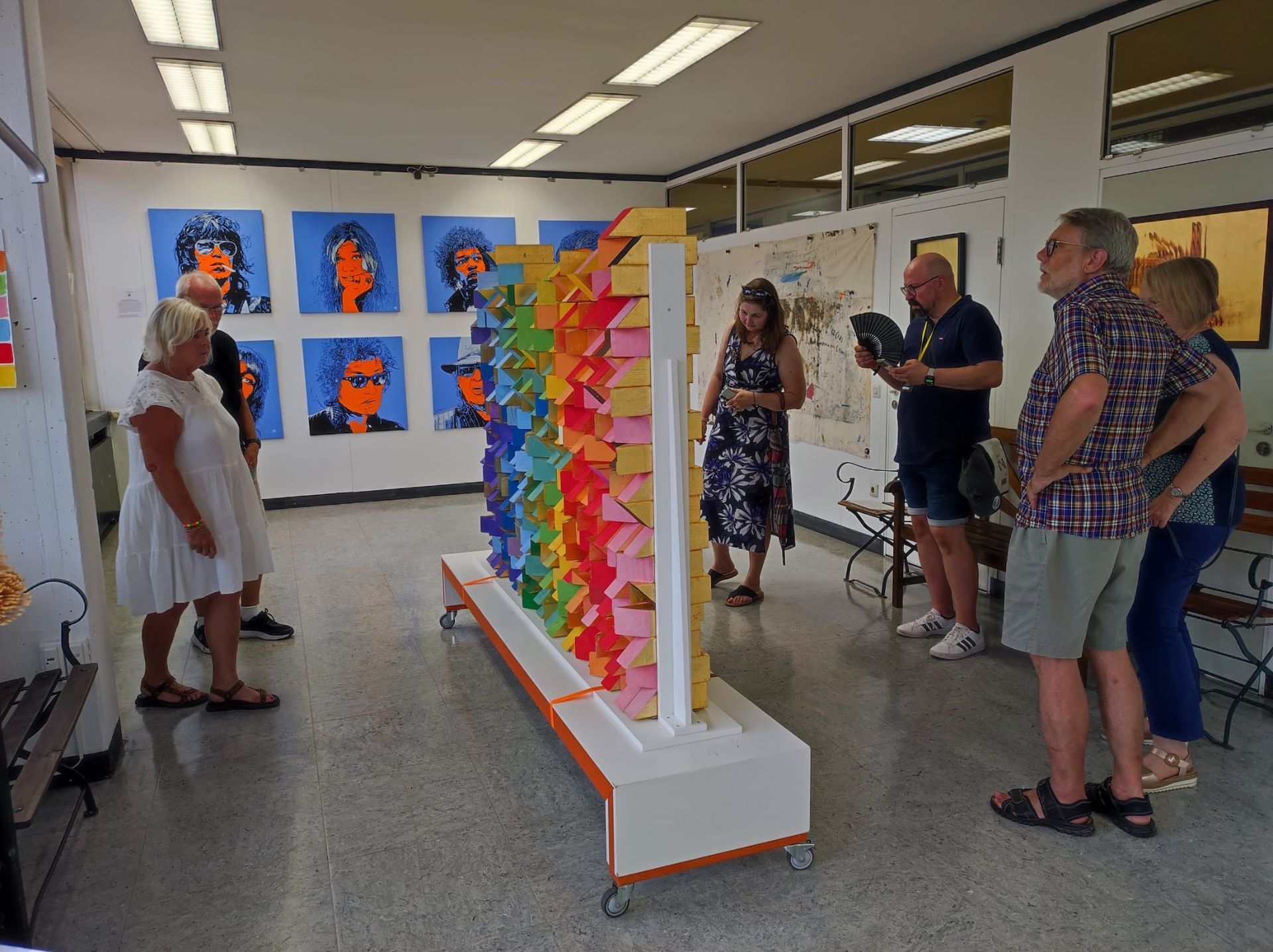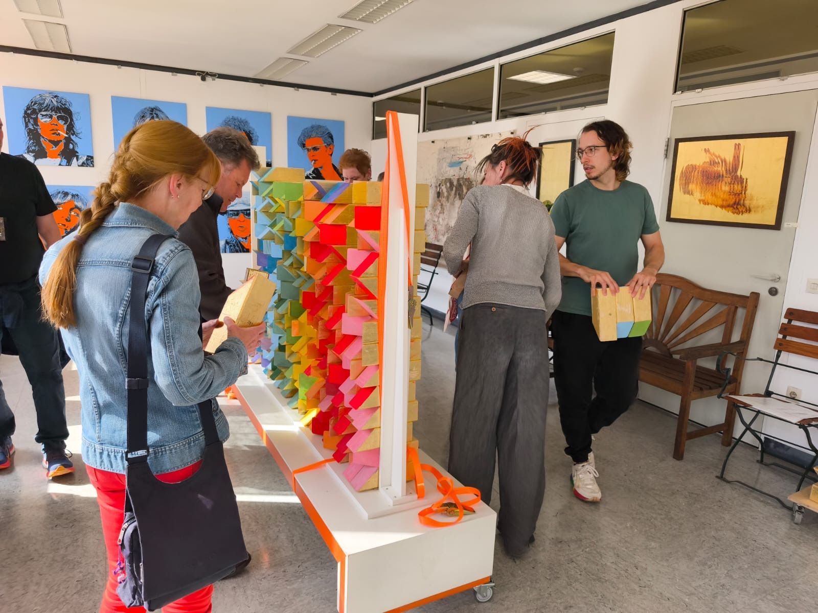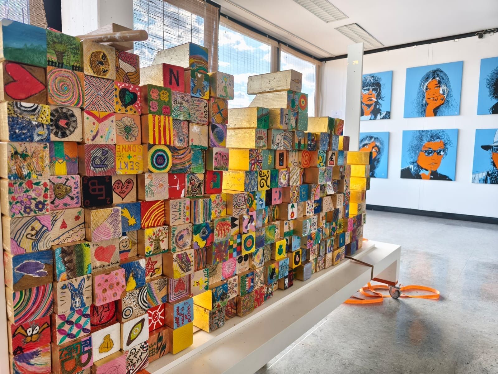 Im Rahmen der Ortung14 kamen viele Besucher um sich das Ergebnis der aufgeschichteten Holzklötze anzuschauen. Selbstverständlich hat die Ateliergemeinschaft stille Post die Gelegenheit genutzt, Werke unserer Künstlerinnen und Künstler zu präsentieren. In unserer Artothek und Flächen auf den Fluren wurden Bilder gezeigt. Ich konnte meine Retrospektive "The golden Years of Pop Culture" in unserem Ausstellungsraum auf einer großen Wandfläche angemessen präsentieren. Es war ein beliebtes Fotomotiv für die Besucher und wurde gern auch als Hintergrund für Erinnerungsbilder genutzt. Mein Atelier war durchgehend von interessierten Besucherinnen und Besuchern belagert.