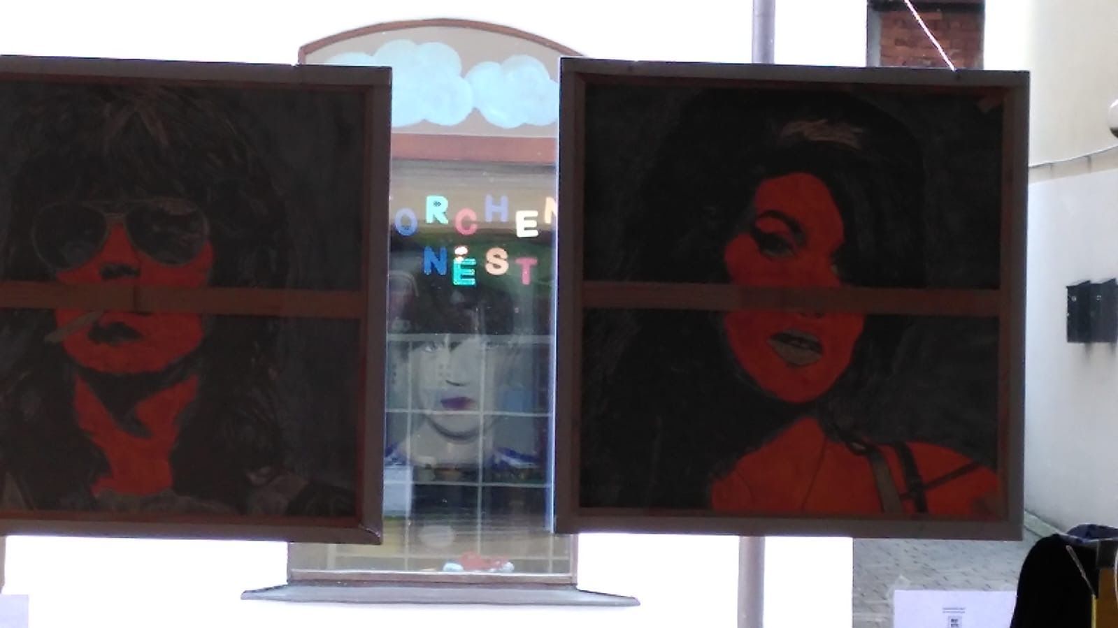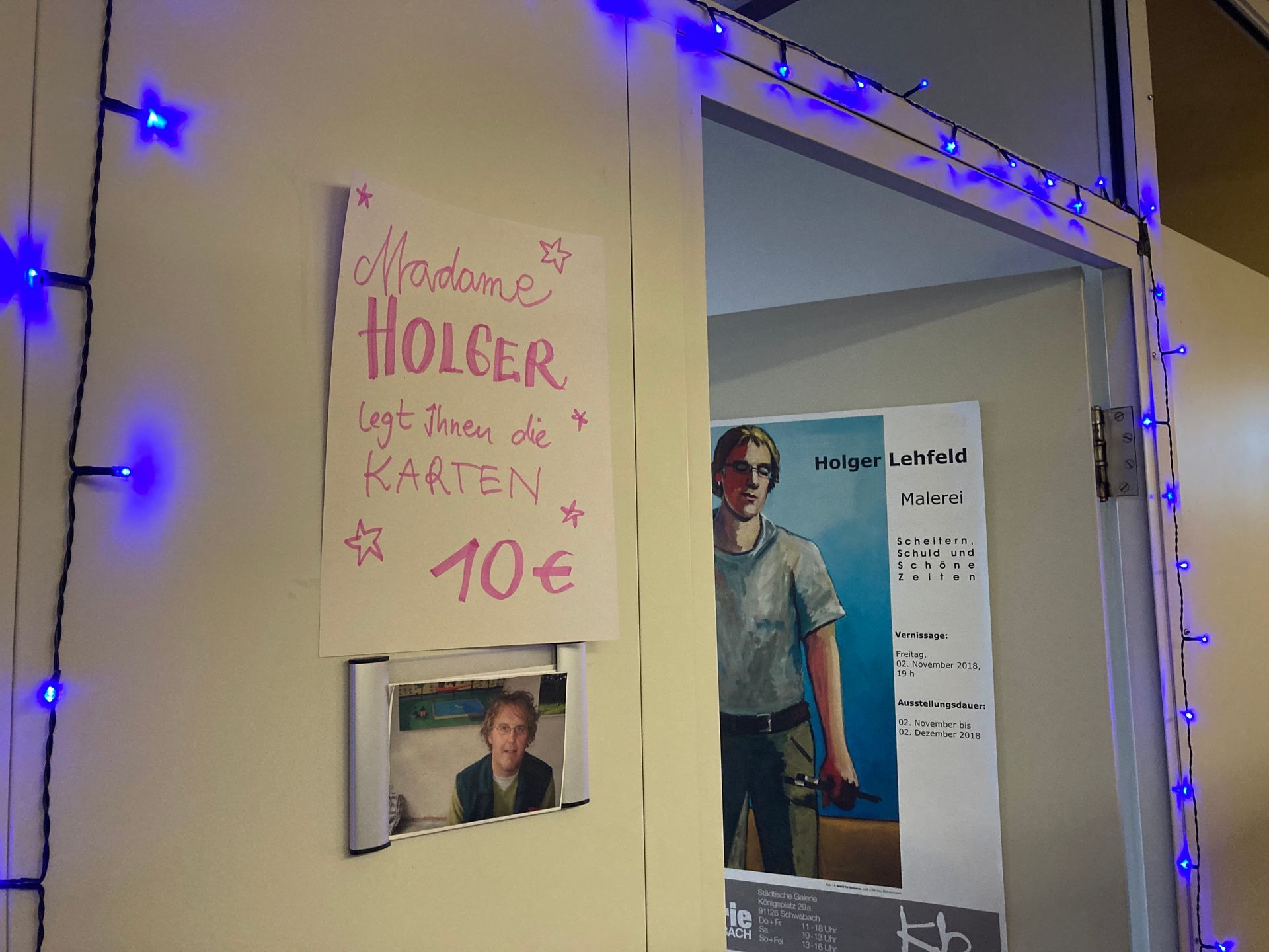 Die Ateliergemeinschaft stille Post hat wieder mal eine Ausstellung und ein bisschen Program außenherum veranstaltet. Es geht auf Weihnachten zu und bevor alle Weihnachtsmärkte die Besucher an ziehen, war Pre-Adven(ture) angesagt. Am Samstag wurde die BesucherInnen aufgefordert Gedichte mit zu bringen, oder vor Ort zu verfassen. Sonntag war es die Aufgabe, uns möglichst kitschigen oder sonst irgendwie gruseligen Christbaumschmuck für unseren Plastikbaum zu schenken. Die BesucherInnen hatten jede Menge Spaß damit und zur Belohnung gab es Glühwein und Lebkuchen. "Madam Holger" hatte, als Räucherstäbchen umnebeltes Medium, durchaus gut zu tun. Unser Künstlerkollege Holger Lehfeld legte Tarot Karten und das wurde gut angenommen. Von meiner "Trilogie des Scheiterns", das werden drei Bilder mit sehr hässlichen Menschen im Format 140x100cm habe ich das erste ausgestellt. Es zeigt einen Obdachlosen. Es wurde als provokant empfunden und hat Reaktionen bei den BesucherInnen ausgelöst. Feedback ist immer gut. Als Maler möchte man Menschen berühren und das ist gelungen. Die neue Serie "Pop Stars" ist sehr gut angekommen, was mich natürlich besonders freut. Am Sonntag hat die Ateliergemeinschaft dann noch, gemeinsam mit den letzten Gästen, ein paar Weihnachtslieder gesungen. Rockig begleitet von meinem genialen Freund und Gitarristen U.C. Singer.