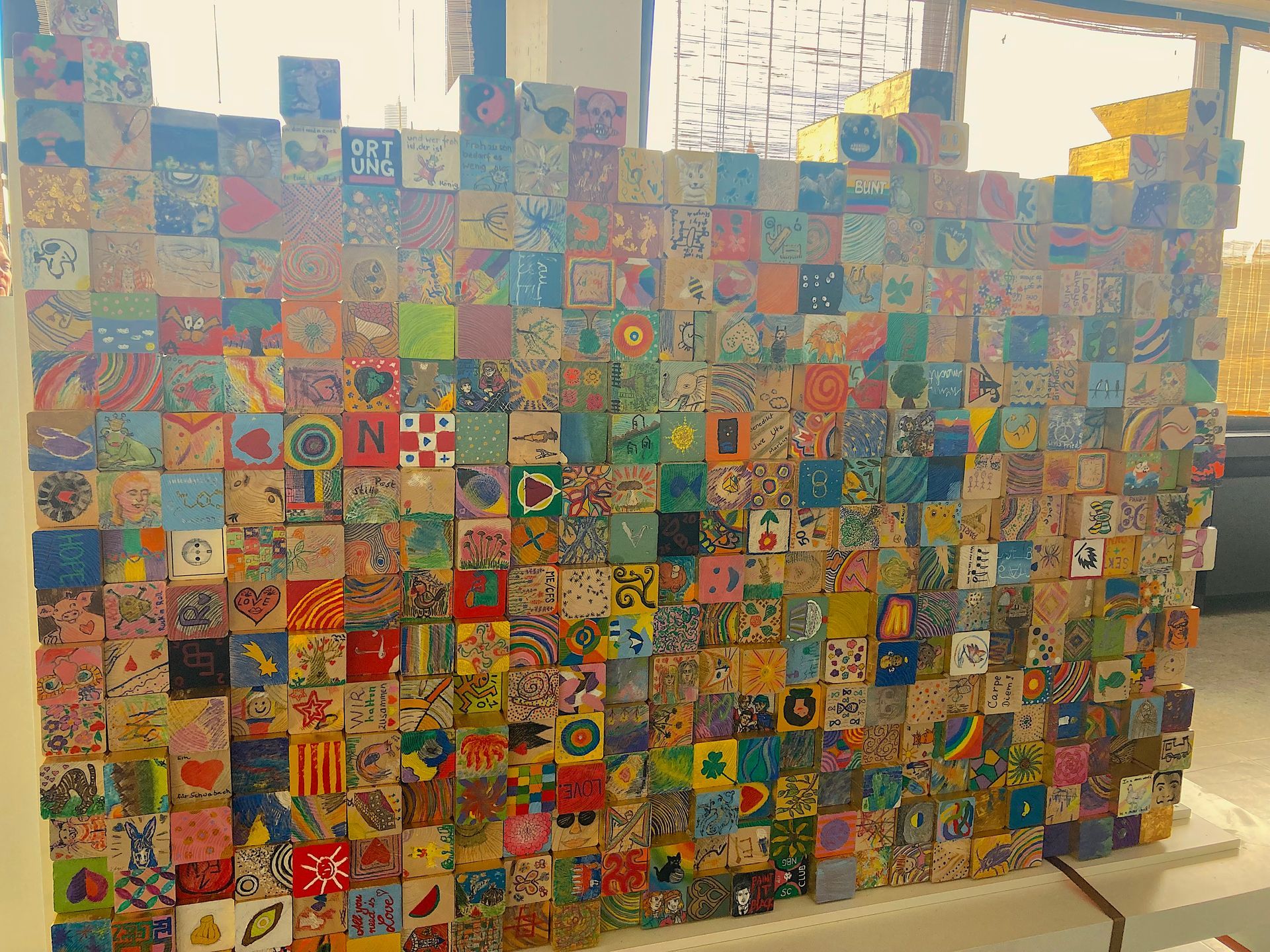 Die Ateliergemeinschaft hatte eine Idee wie wir uns im Rahmen der Ortung einbringen könnten. Ein Gemeinschaftskunstwerk bei dem alle mitmachen können: vom Chaos zur Ordnung. Wir haben 430 Holzklötzchen erstellt, ringsherum vergoldet und zugeschnitten. Schwabacher Bürgerinnen und Bürger haben wir auf zwei Terminen auf dem Marktplatz und zwei bei uns in der Werkskantine der stillen Post gebeten mit zu machen. Es galt die gerade abgeschnittene Seite mit einem Motiv nach Lust und Laune zu bemalen, die abgeschrägte Seite sollte einfarbig, in von uns definierten Farbtönen bemalt werden. Wir haben es tatsächlich geschafft 427 Klötze zu bemalen.